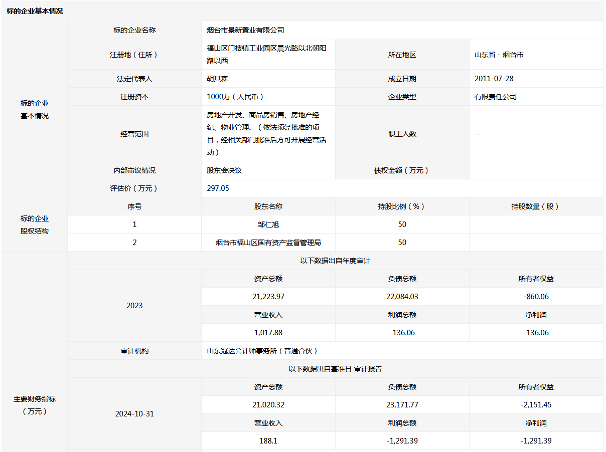 煙臺(tái)市景新置業(yè)有限公司50%國有股權(quán)