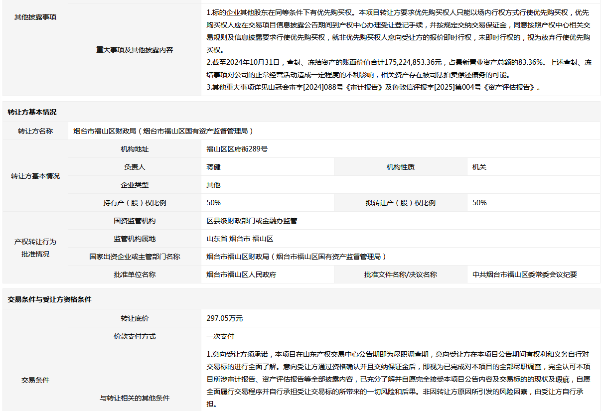 轉(zhuǎn)讓方: 煙臺(tái)市福山區(qū)財(cái)政局(煙臺(tái)市福山區(qū)國有資產(chǎn)監(jiān)督管理局)
