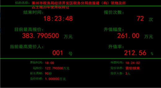 近日,萊州市稅務(wù)局經(jīng)濟(jì)開發(fā)區(qū)稅務(wù)分局所屬房屋建筑物及所占土地20年使用權(quán)轉(zhuǎn)讓項(xiàng)目在煙臺(tái)產(chǎn)權(quán)掛牌并有多個(gè)意向受讓方報(bào)名,最終,經(jīng)過72輪激烈報(bào)價(jià),項(xiàng)目較掛牌底價(jià)122萬(wàn)元,增值261萬(wàn)元,增值率高達(dá)212.56%,不但保證了疫情期間國(guó)有產(chǎn)權(quán)業(yè)務(wù)的正常開展,而且?guī)椭a(chǎn)權(quán)持有人實(shí)現(xiàn)了價(jià)值最大化。