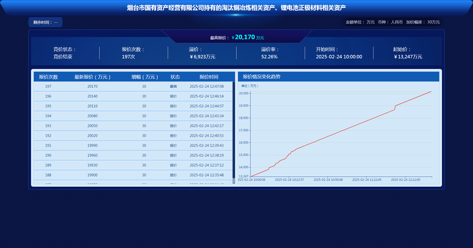 2月24日,“煙臺市國有資產經營有限公司持有的淘汰銅冶煉相關資產、鋰電池正極材料相關資產項目”在山東產權交易中心以網絡競價方式成功出讓。此次交易歷經197輪激烈競價,持續(xù)近3小時,最終成交金額定格在20170萬元,高于評估價8980萬元,較掛牌價溢價6923萬元,溢價率高達52.26%,成功創(chuàng)下煙臺聯合產權2025年首季資產盤活的“開門紅”。